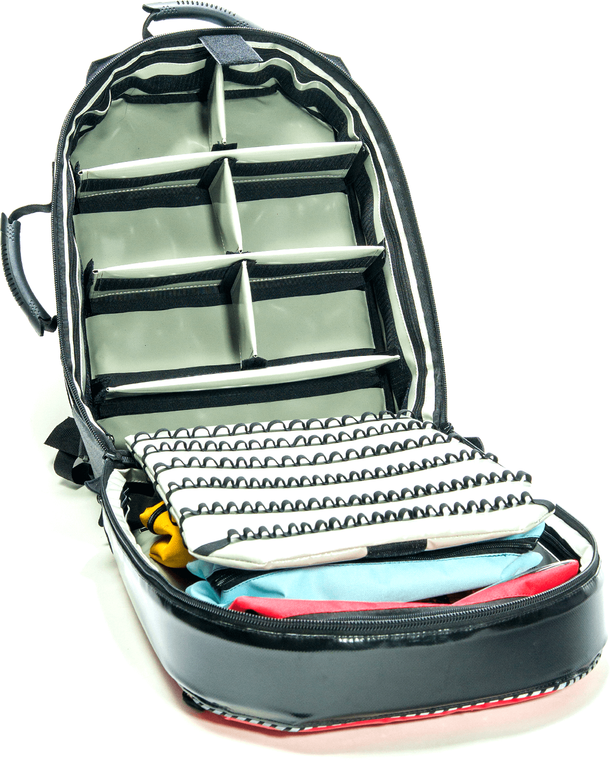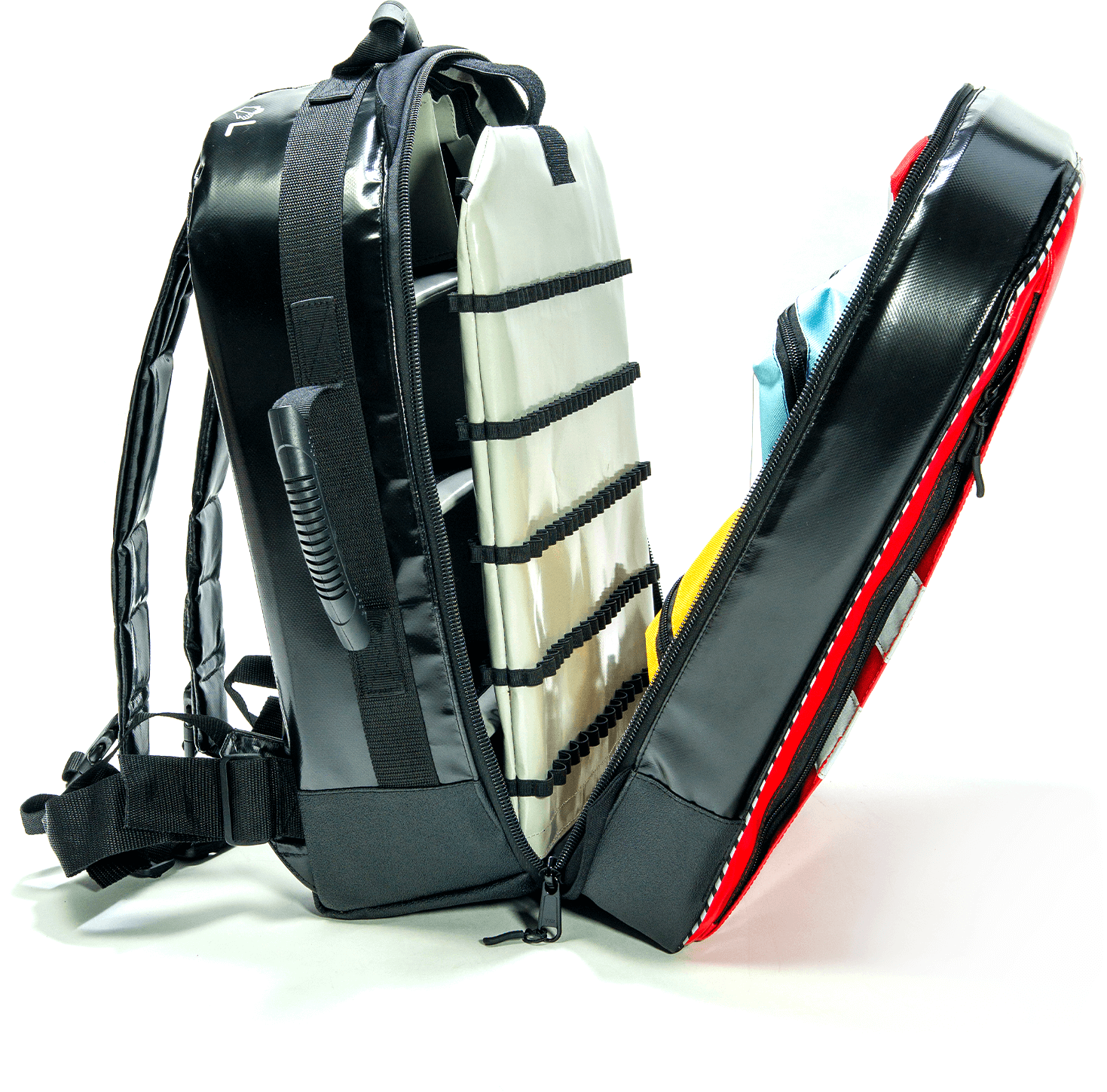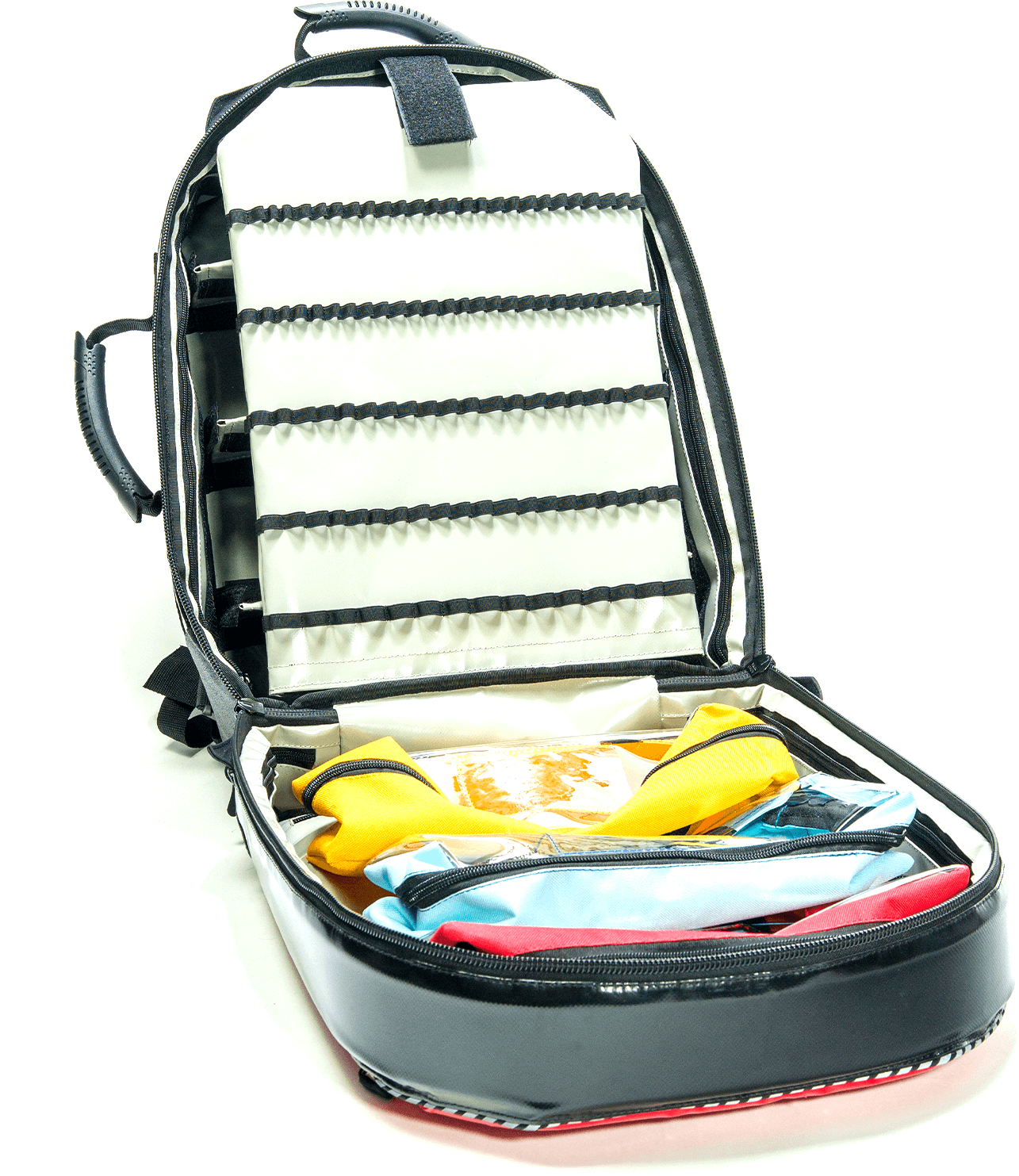 Plecak stworzony z my艣l膮 o profesjonalnym u偶yciu przez ratownik贸w medycznych, zespo艂y pierwszej pomocy oraz s艂u偶by interwencyjne. Przystosowany do transportu i szybkiego dost臋pu do sprz臋tu medycznego. Wykonany z trwa艂ego, wodoodpornego materia艂u Complan i Hypalon, co zapewnia odporno艣膰 na warunki atmosferyczne oraz 艂atwo艣膰 dezynfekcji. Liczne elementy odblaskowe u艂atwiaj膮ce widoczno艣膰 w warunkach nocnych i trudnych atmosferycznie. Konstrukcja jednokomorowa zapinana na zamek dwukierunkowy z przedni膮 kieszeni膮 zapewniaj膮c膮 szybki dost臋p. Specjalne gumowe kieszenie na szczycie plecaka przeznaczone na r臋kawiczki z nadrukiem dotycz膮cym rozmiaru d艂oni u艂atwiaj膮cym szybki dob贸r w艂a艣ciwego rozmiaru. Sp贸d wzmocniony materia艂em odpornym na 艣cieranie oraz plastikowymi podstawkami chroni膮cymi przed uszkodzeniami mechanicznymi. System transportu obejmuje uchwyty umo偶liwiaj膮ce wygodne przenoszenie w pozycji pionowej i poziomej, regulowane szelki naramienne wy艣cie艂ane piank膮 oraz pas biodrowy zwi臋kszaj膮cy stabilno艣膰. W sytuacji przenoszenia plecaka w r臋ku system szelek mo偶na 艂atwo schowa膰 w specjaln膮 kiesze艅. Wn臋trze przystosowane do mocowania na rzep wk艂adu z mo偶liwo艣ci膮 demonta偶u dla 236 ampu艂ek. System mocowania na rzep umo偶liwia dowoln膮 konfiguracj臋 uk艂adu torebek (3 szt.) oraz przegr贸dek (6 szt.) u艂atwiaj膮c w艂a艣ciw膮 segregacj臋 sprz臋tu dzi臋ki zastosowaniu r贸偶nych kolor贸w torebek.